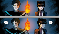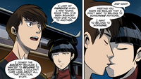 After the group returned to the Fire Nation Uppercase, Mai expressed her frustration at Zuko's disregard for other's feelings to Kei Lo and realized that she was however preoccupied with Zuko's actions. Although she reminisced over her past relationship in her room and looked at a picture of her with Zuko, she promptly fix the image aside to look at one of her and Tom-Tom, prioritizing her family over her feelings.[15]