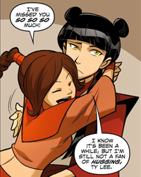 After the 2 girls were released from prison with the Hundred Yr War's determination,[8] Mai and Ty Lee maintained a potent friendship, despite not existence together all that often. Equally such, she entrusted Ty Lee and the Kyoshi Warriors with Zuko's protection following several threats made against his life[13] and tolerated being hugged by her. Mai's trust in her Ty Lee connected to be strong, as she readily enlisted her assist to gauge Kei Lo's true intentions and learn more nigh Ukano's plans for overthrowing Zuko. Their friendship was comfy plenty that they could vocalism criticism near each other, as Ty Lee berated Mai for feigning affection for Kei Lo to get him to talk, scolding her for being "fake" and dishonest, while Mai chided Ty Lee for existence what she saw as fiddling. Withal, the two continued to back up each other and made an constructive team in combat.[five]