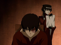 Mai openly cooperated with Azula'southward efforts to capture Zuko, Iroh, and the Avatar, and was an active participant in the capture of Ba Sing Se.[eighteen] Yet, she also displayed a lack of regard for her orders. When the Fire Nation attempted to drill through the Outer Wall of Ba Sing Se, she refused to pursue Sokka and Katara through the drill's slurry arrangement, saying that Azula could "shoot all the lightning she [wanted]" at her.[16] She refused to fight Team Avatar in Ba Sing Se out of boredom, allowing them to merely take the Earth King'due south carry Bosco abroad without whatsoever struggle.[18] Azula decided to return to the Fire Nation with her imprisoned uncle Iroh and drag Zuko forth. When he refused, Azula used Zuko and Mai'south childhood crushes on each other to convince him otherwise, arranging a dinner date between the 2. The two caught on to her scheme; however, they did eventually reunite and Zuko agreed to come up home.[10]